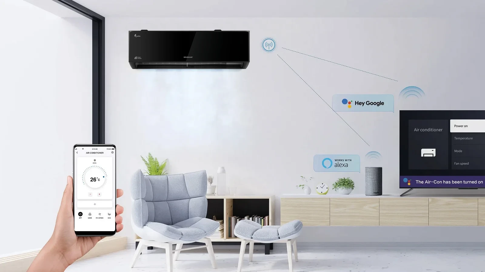 Shijoni kontrollin 24/7 përmes aplikacionit Bruno Home për pajisjet inteligjente. Operoni në distancë funksionet nëpërmjet aplikacionit ose kontrolloni nëpërmjet komandave të thjeshta përmes zërit.
